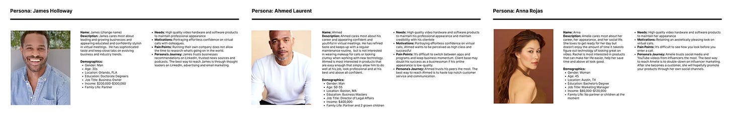 まず、プロダクトのリブランドにあたって、想定するターゲットオーディエンスや、既存ユーザーの層から、いくつかのペルソナを作るところから始めました。