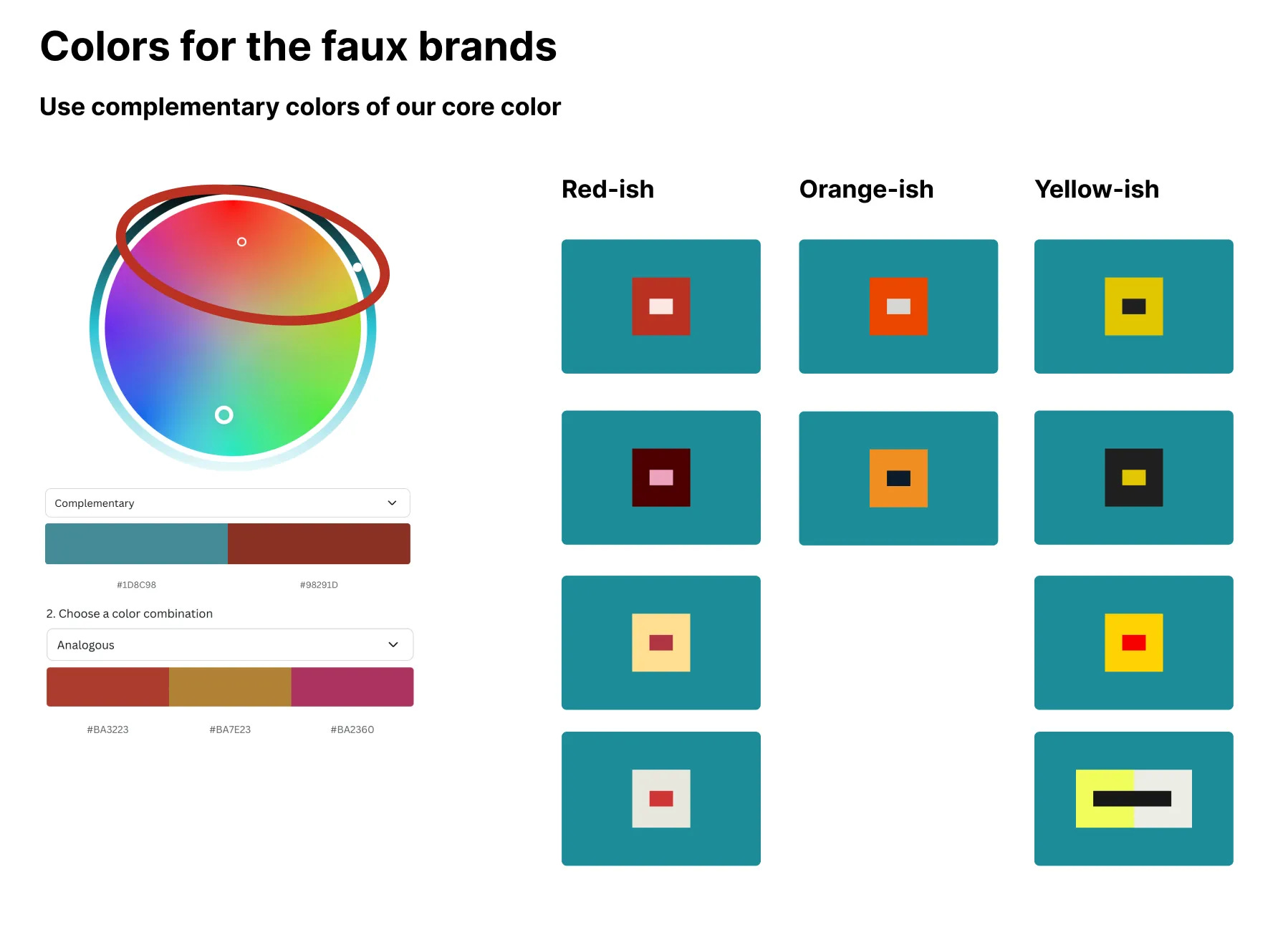 次に、架空の会社のブランドカラーを設計しています。自由に架空のブランドについて思いを巡らせたいところではありますが、その前に Airtime のブランドカラーの補色を使うという制約を持ちました。