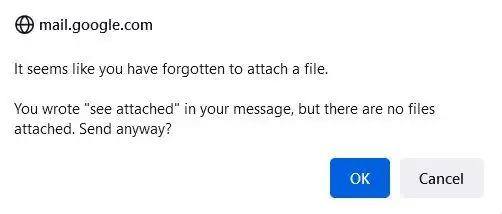 送ろうとしているメールの本文中に「添付しました」と書いているにもかかわらず、添付したファイルが存在しないまま送信のボタンを押した際に「ファイルを添付するのを忘れていませんか?」という警告ダイアログを出てきます。