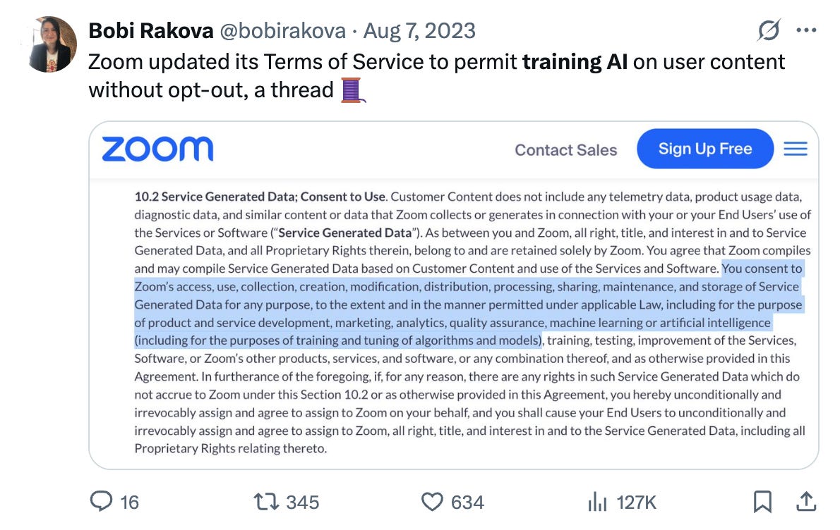 例えば、Zoom の利用規約に AI の学習への同意が追加され、当初はオプトアウトする手段(同意撤回の選択肢)が提供されていないという問題が指摘されていました。