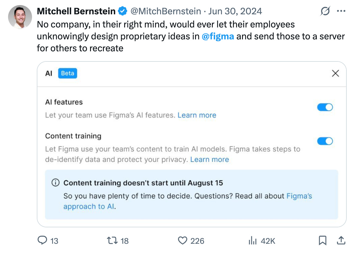 Figma では AI 機能でユーザーのファイルを学習に利用する設定がデフォルトで有効になっていたことがありました。特に企業ユーザーからは、機密情報が含まれる可能性のあるデザインファイルが無断で学習データとして使われることへの強い懸念がみられました。