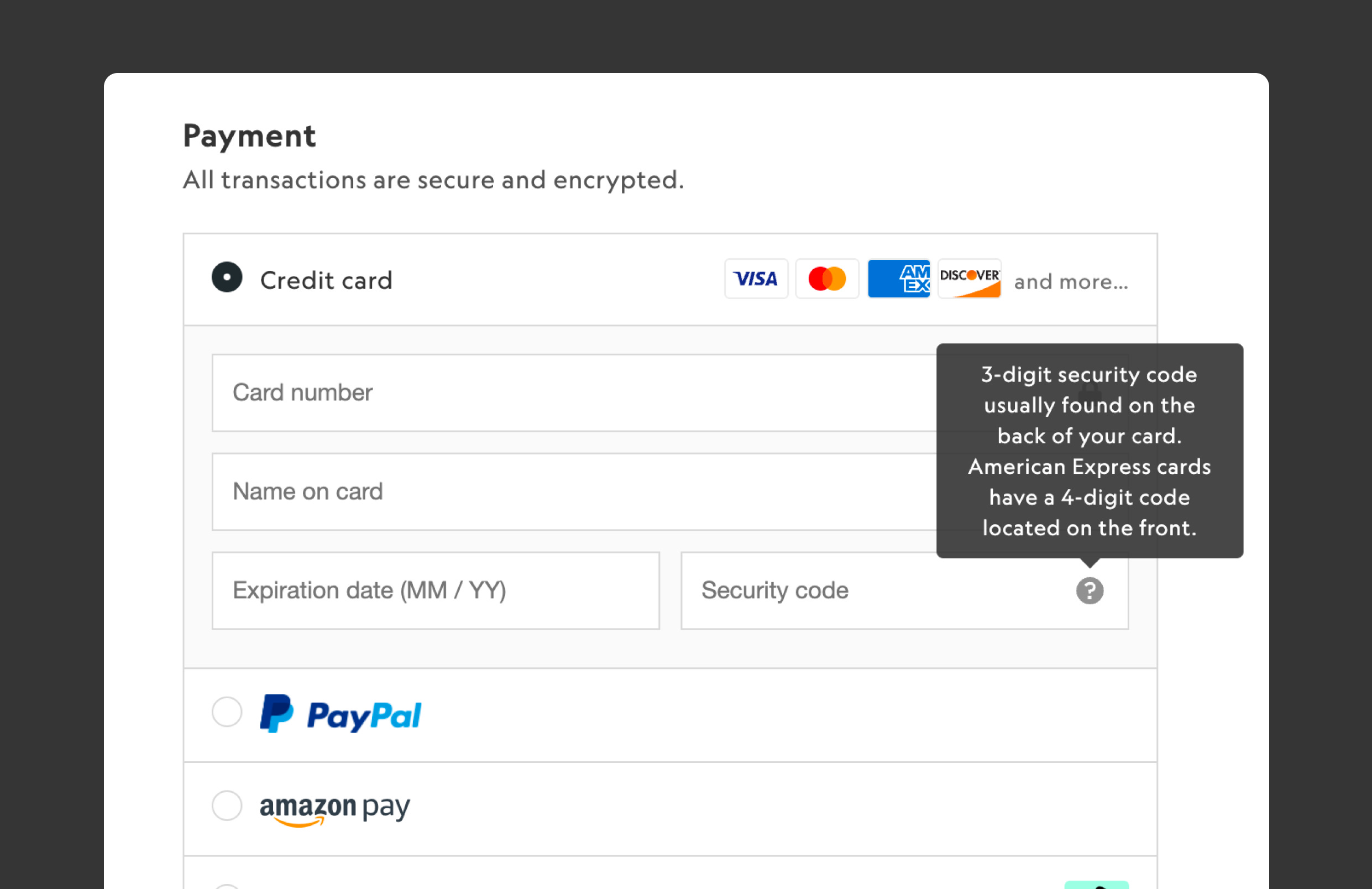 例えば、クレジットカードの情報の入力フォームで「セキュリティコード」の欄で ❓ や ℹ️ のようなアイコンを見たことはありますよね。アイコンにカーソルを合わせると